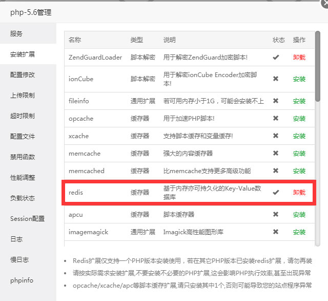 寶塔面板——軟件管理——運(yùn)行環(huán)境——php5.6(選擇你使用的版本號)——安裝擴(kuò)展——Redis——安裝。