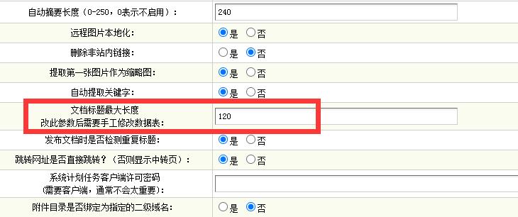 首先:進入后臺 -> 系統(tǒng) -> 系統(tǒng)基本參數(shù)->其它選項 -> 文檔標題最大長度把次參數(shù)修改為需要設(shè)置的標題最大長度,默認參數(shù)是60,一般我們修改成120(根據(jù)需要填寫數(shù)值)。如下圖: