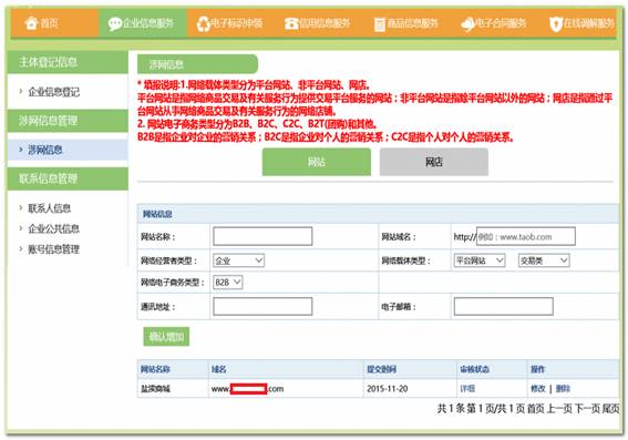 企業(yè)主體可對其開辦的網(wǎng)店或網(wǎng)站進行管理涉網(wǎng)信息登記,如下所示: