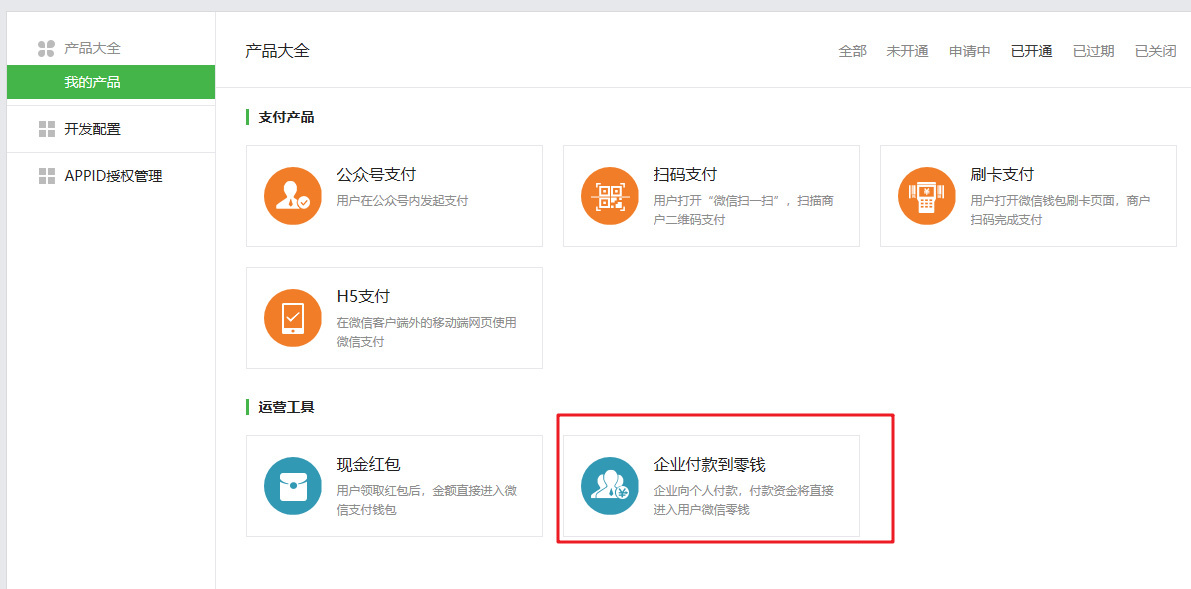 這里給出微信企業(yè)付款到零錢的鏈接:https://pay.weixin.qq.com/index.php/public/product/detail?pid=5&productType=0