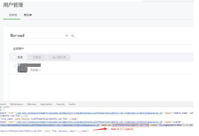 首先關(guān)注公眾號(hào),在公眾號(hào)中點(diǎn)用戶管理,找到需要轉(zhuǎn)賬的用戶,點(diǎn)頭像右鍵審查元素,data-id就是openid