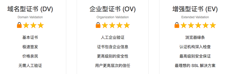 通常來(lái)說(shuō),SSL 證書分為三大類,他們的安全性是遞增的,當(dāng)然價(jià)格和安全系數(shù)成正比。