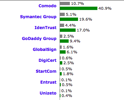 下圖是 w3techs.com 16 年 2 月發(fā)布的 SSL 證書市場(chǎng)份額報(bào)告中的部分截圖。