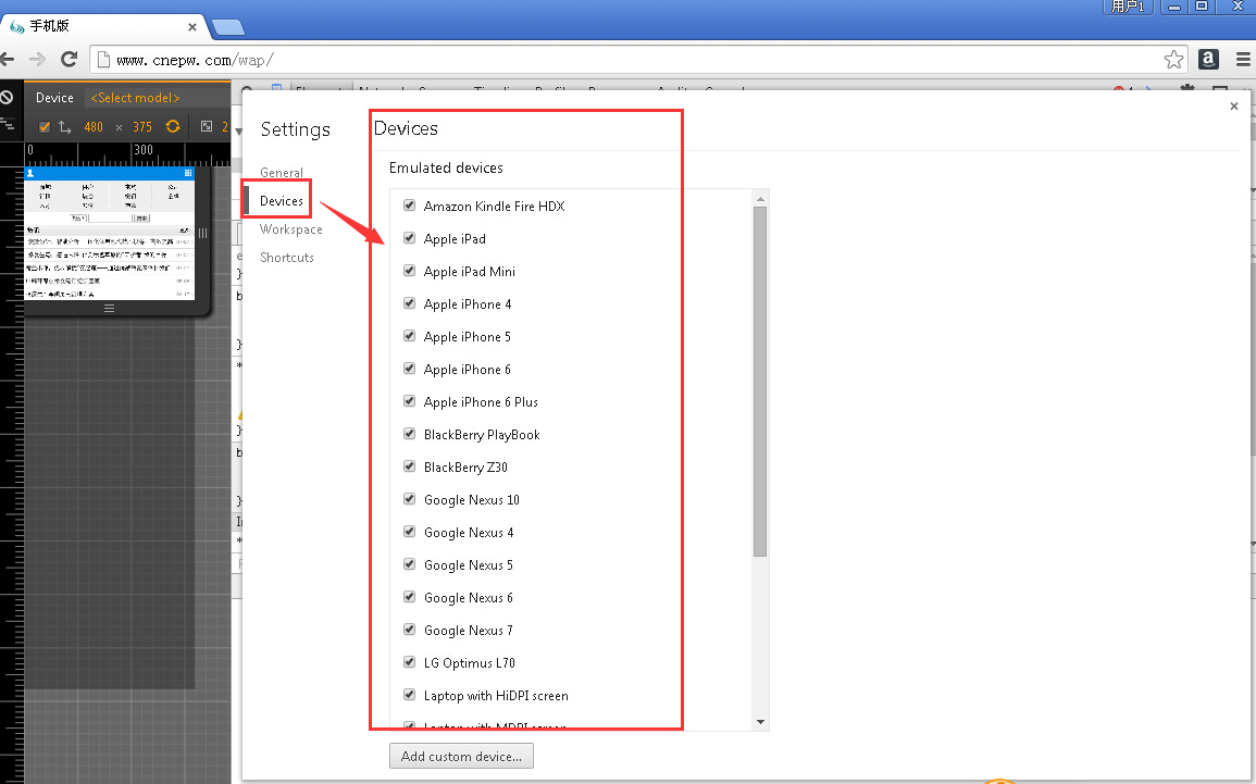 左邊就是下拉式菜單就是要選擇的模擬手機端網(wǎng)站測試界面。上圖右邊紅線框根據(jù)自己需要,可以自定義添加刪除手機端模擬測試的手機設(shè)備,這樣就可以測試不同手機設(shè)備的不同手機網(wǎng)站的界面了,有利于手機網(wǎng)站開發(fā)者,開發(fā)適應(yīng)不同手機設(shè)備的網(wǎng)站界面兼容性問題上得到了很好的解決。