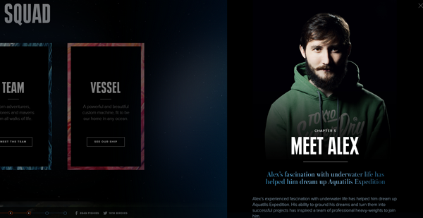 其實我們提過的很多特效都在該網(wǎng)站得到了體現(xiàn),運用了大量的網(wǎng)頁新技術(shù),比如WebGL技術(shù)、序列幀動畫……尤其在頁面切換時的動效。