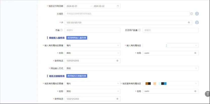 根據(jù)頁面提示完成信息填寫,包括網(wǎng)站名稱、是否有工信部備案號、網(wǎng)站開通日期、域名信息、服務器IP地址、網(wǎng)絡接入服務商和域名注冊服務商信息、網(wǎng)站服務類型(是否涉及管制信息發(fā)布)、相關前置許可選擇、網(wǎng)站語種選擇等,注意填寫網(wǎng)站全稱及主域名,需要上傳域名證書電子檔,IP地址是指公網(wǎng)IP,不要填寫內(nèi)網(wǎng)IP。