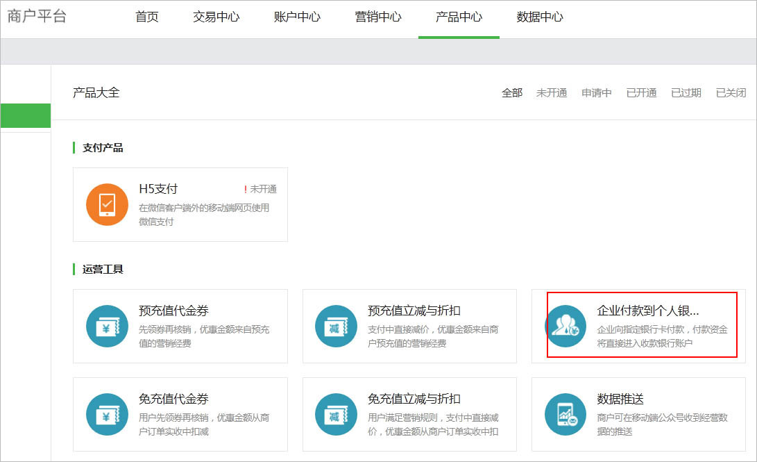 管理員安裝證書后登錄商戶平臺(tái),點(diǎn)擊【產(chǎn)品中心】—>【企業(yè)付款到個(gè)人銀行卡】點(diǎn)擊申請(qǐng)開通;